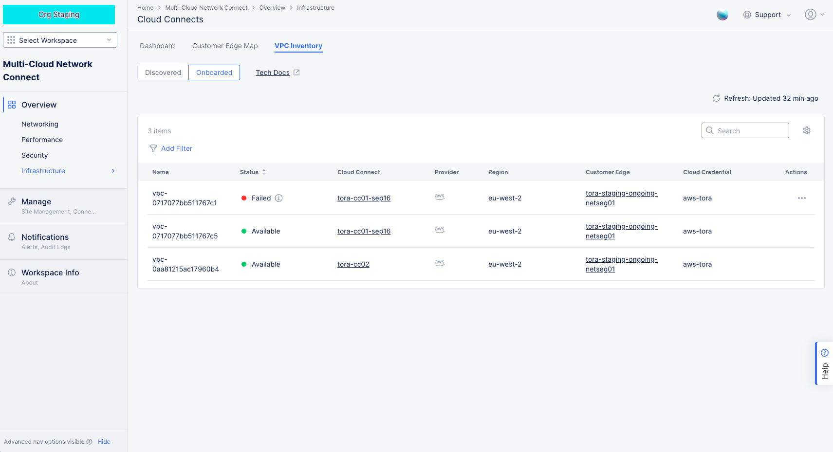 - Onboarded VPCs shows the number of VPCs that have been onboarded into a Cloud Connect. Click Onboarded VPCs to see details on the VPC Inventory tab. From there you can also onboard additional VPCs.